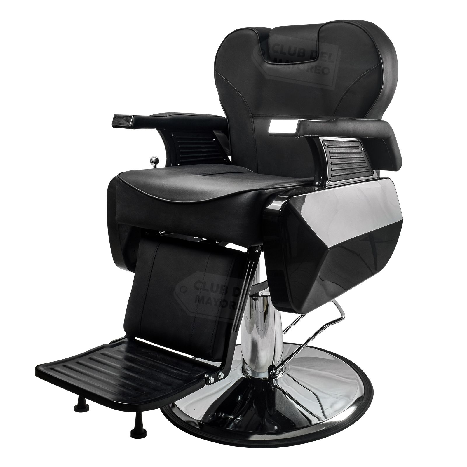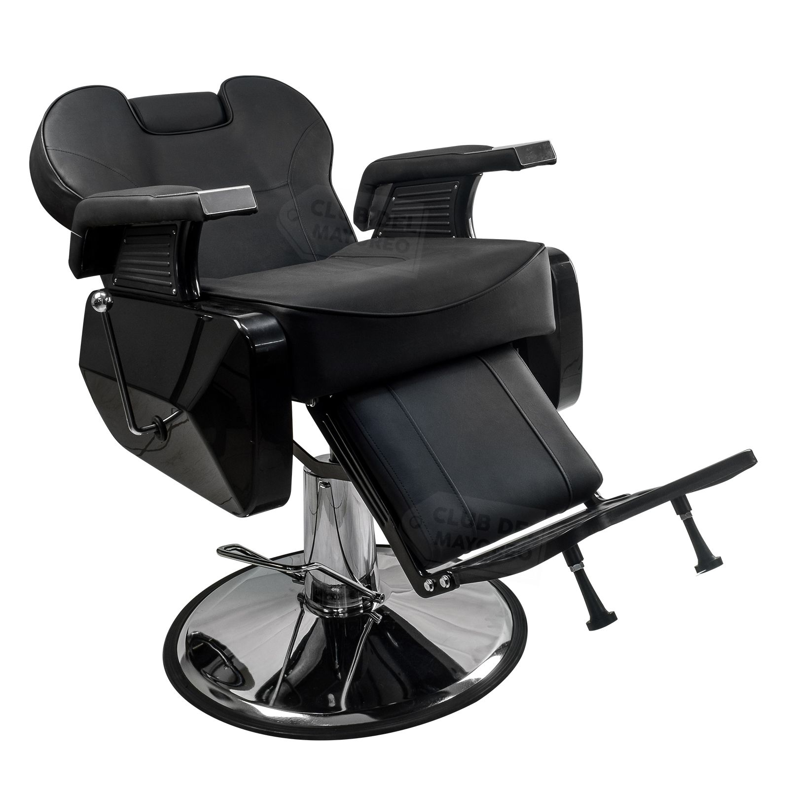 Silla profesional para peluqueria o estetica modelo robusto y detallada en cubiertas y diseños profesionales. Se puede reclinar en un ángulo de hasta 150 grados para mejorar la posicion segun se requiera. Su base y asiento puede girar en cualquier direccion para facilitar la posicion. La capacidad de ajustar la altura deseada con su pedal inferior. Forro de vinipiel color negro resistente a rasgaduras y en su interior en una base comoda de foam moldeable para brindar mayor comodidad. Descansapies en plataforma con goma antiderrape que se ajusta segun en angulo de reclinacion de la silla. La silla tiene la capacidad de soportar un peso máximo de 140 Kg.