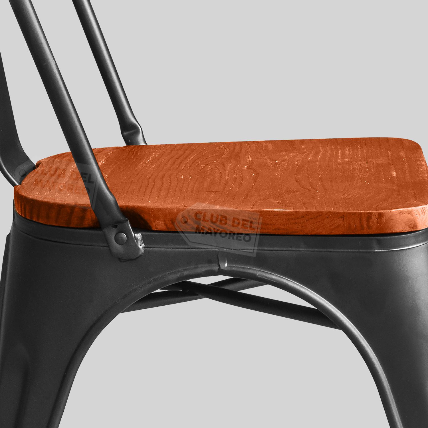 Silla metalica diseño tolix ideal para exteriores, cafeterías, restaurantes, fondas, jardín, patio, etc. Fabricadas en resistente material de metal ligeras para fácil transporte. Estructura color negro mate con asiento comodo en madera y respaldo anatómico curvo para mayor confort. Se pueden apilar para ahorrar espacio en el almacenaje. La silla puede soportar un peso de 150 Kgs.